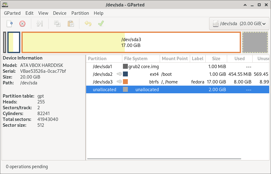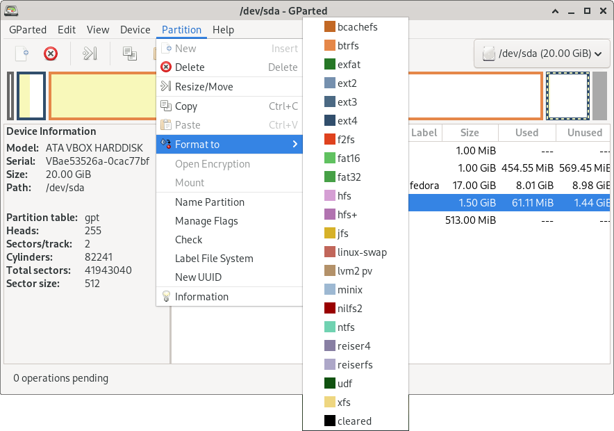GParted main window displaying disk device partitions.